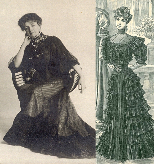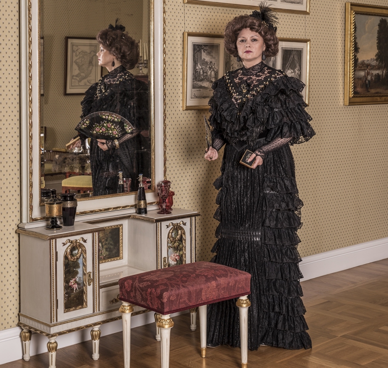 Inspiracja sukniami polskiej aktorki Heleny Modrzejewskiej na podstawie wzorów z Tygodnika Mód i Powieści z 1905 roku (nr tablicy 46). Sesja zdjęciowa w Pałacyku Pułaskiego w Warce w pokoju eklektycznym, stylizowanym na pokój Heleny Modrzejewskiej. Suknia uszyta z kilkunastu metrów czarnej koronki.
