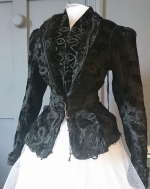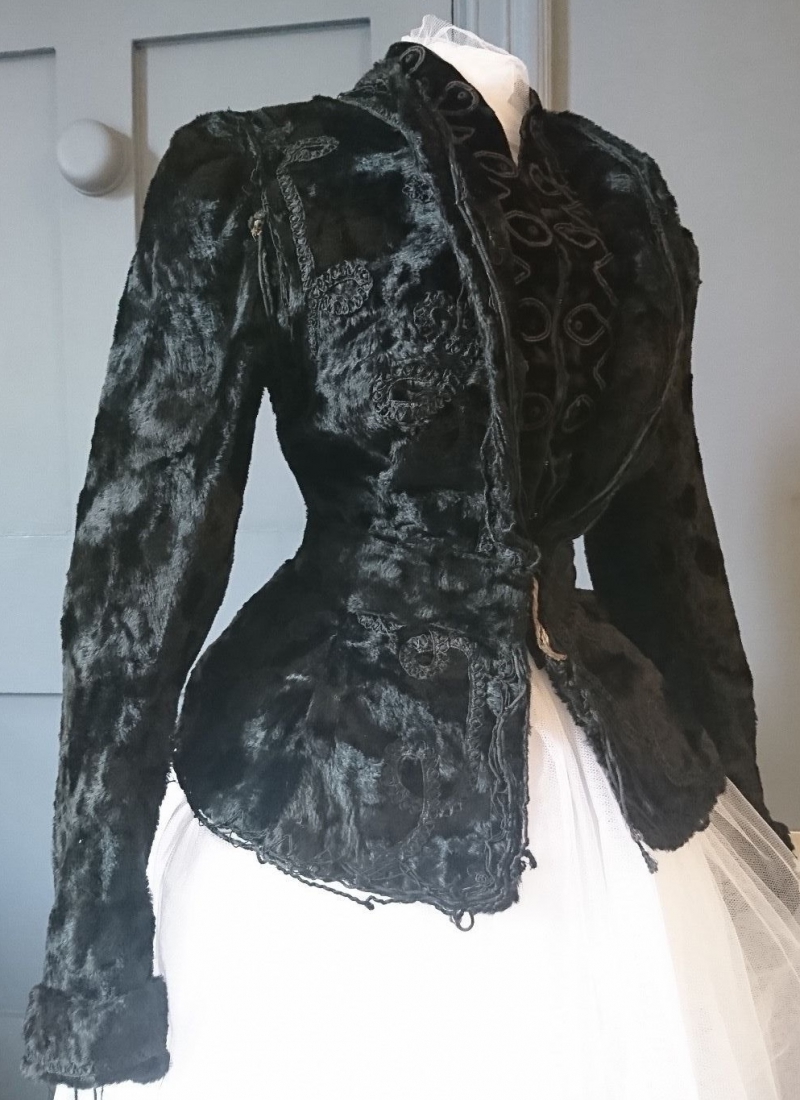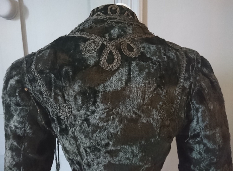 Czarne futro z cieląt ozdobione haftem z czarnego sznurka. Dopasowane w talii z baskinką. Unikalny wzór. Zachowane w stanie idealnym poza drobnymi uszkodzeniami aplikacji sznurka. Jego datowanie to ostatnia dekada XIX wieku.