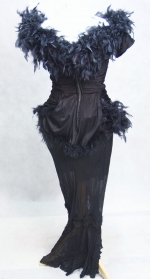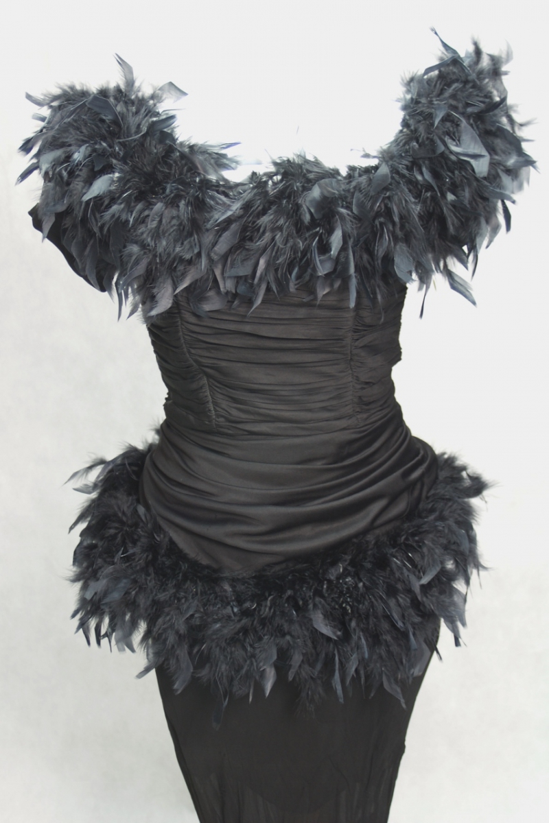 Czarny gorset od amerykańskiej sukienki, przysłanej do Polski tuż zaraz po II wojnie światowej. Gorset jest drapowany, swoją konstrukcję opiera na fiszbinach. Ma delikatnie opadające, drapowane rękawki i falę przysłaniającą brzuch. Zapinany na metalowy zamek z haftką na końcu. Pięknie profilowany tył.