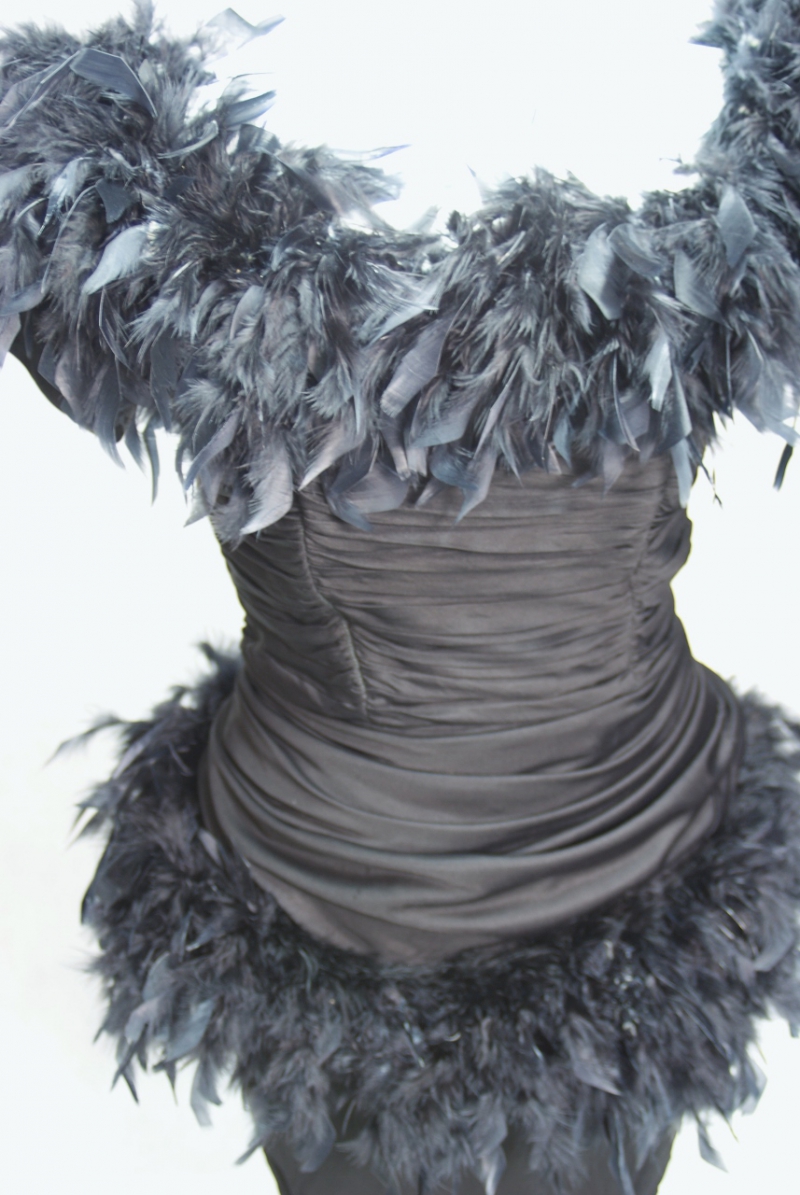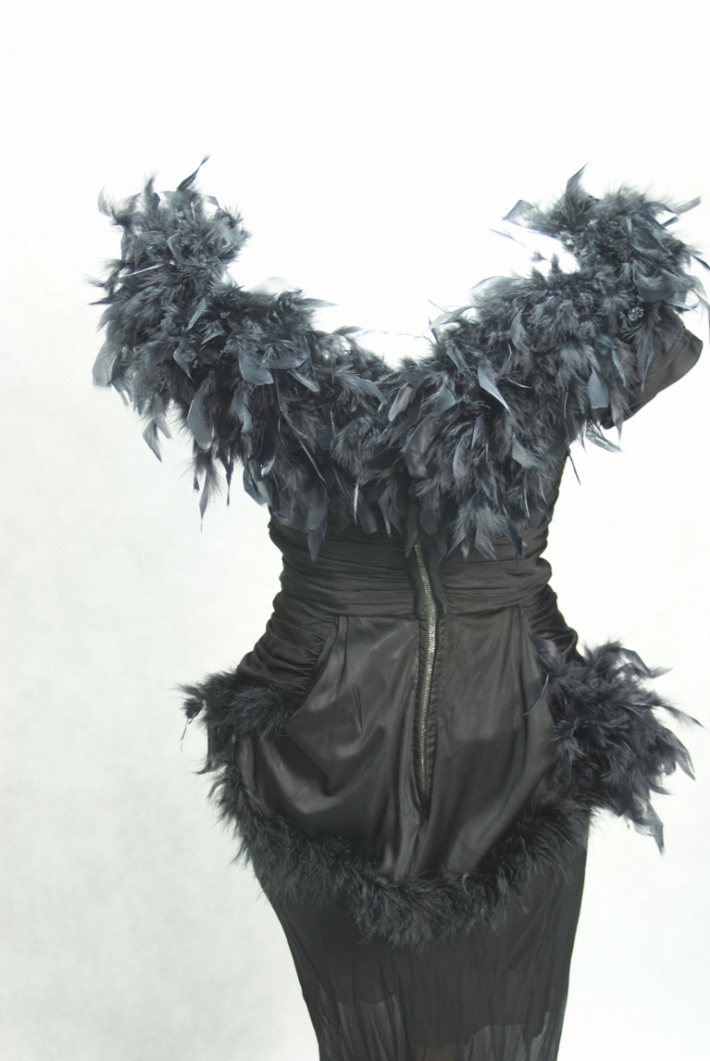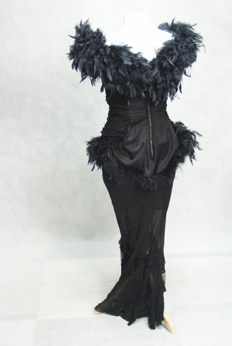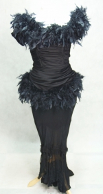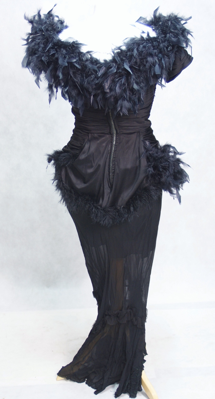 W pierwotnej wersji była to sukienka długości 3/4 w kształcie opinającego ciało dzwonu w tego samego materiału. Niestety została odcięta w latach 80-tych XX wieku z uwagi na rozległe zniszczenia i przetarcia. Jest to sukienka, w której cztery pokolenia kobiet prezentowały się na najbardziej znamienitych imprezach wieczorowych i balach przez ponad 70 lat . Pióra zostały doszyte w latach 80-tych XX wieku.