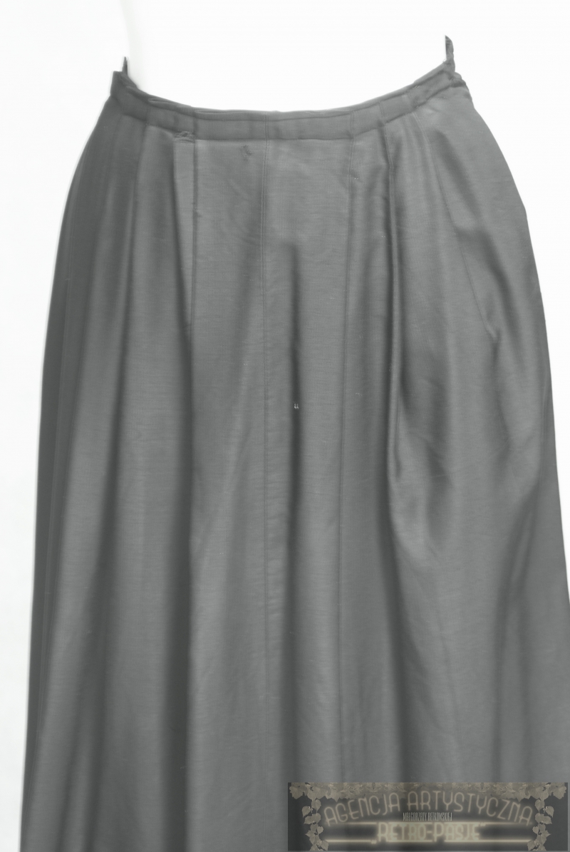 z błyszczącego materiału - bardziej jedwabiu. Wielokrotnie poszerzana wstawkami z innego gatunku i odcienia materiału. W pasie symetryczne potrójne zakładki.