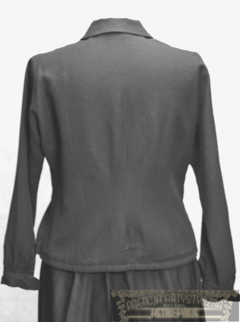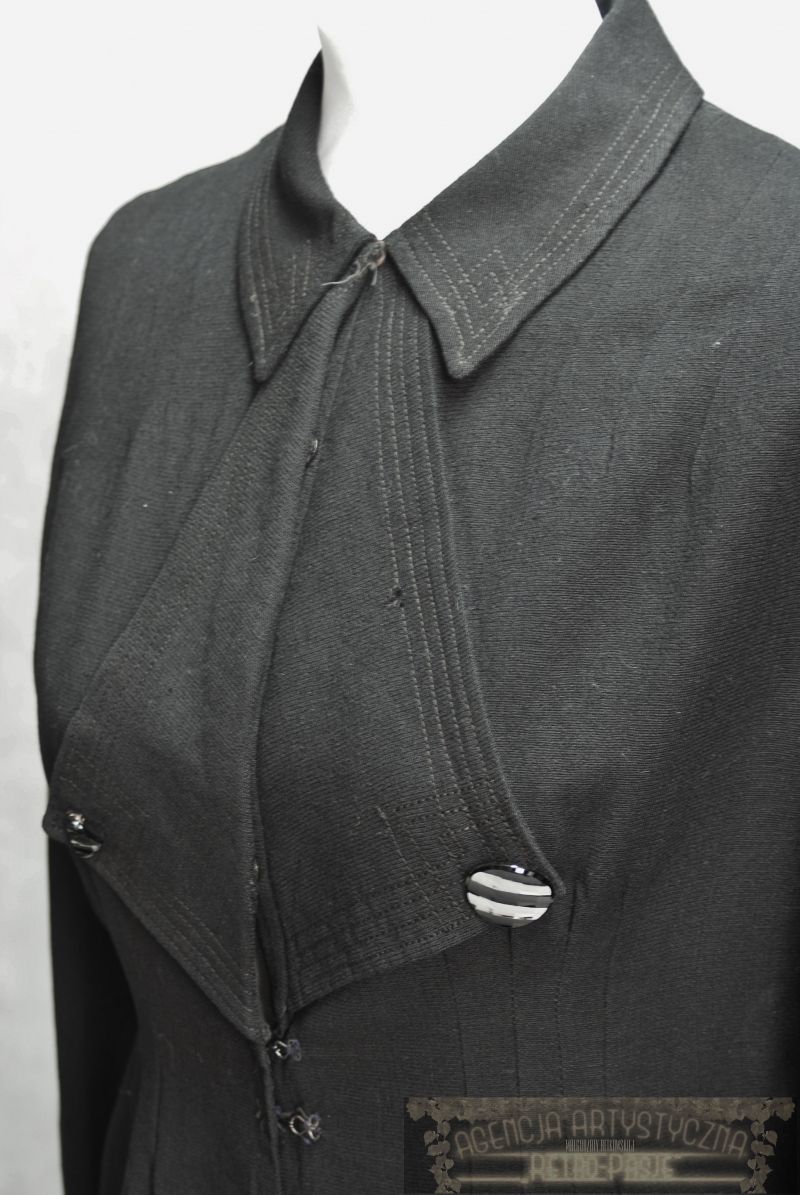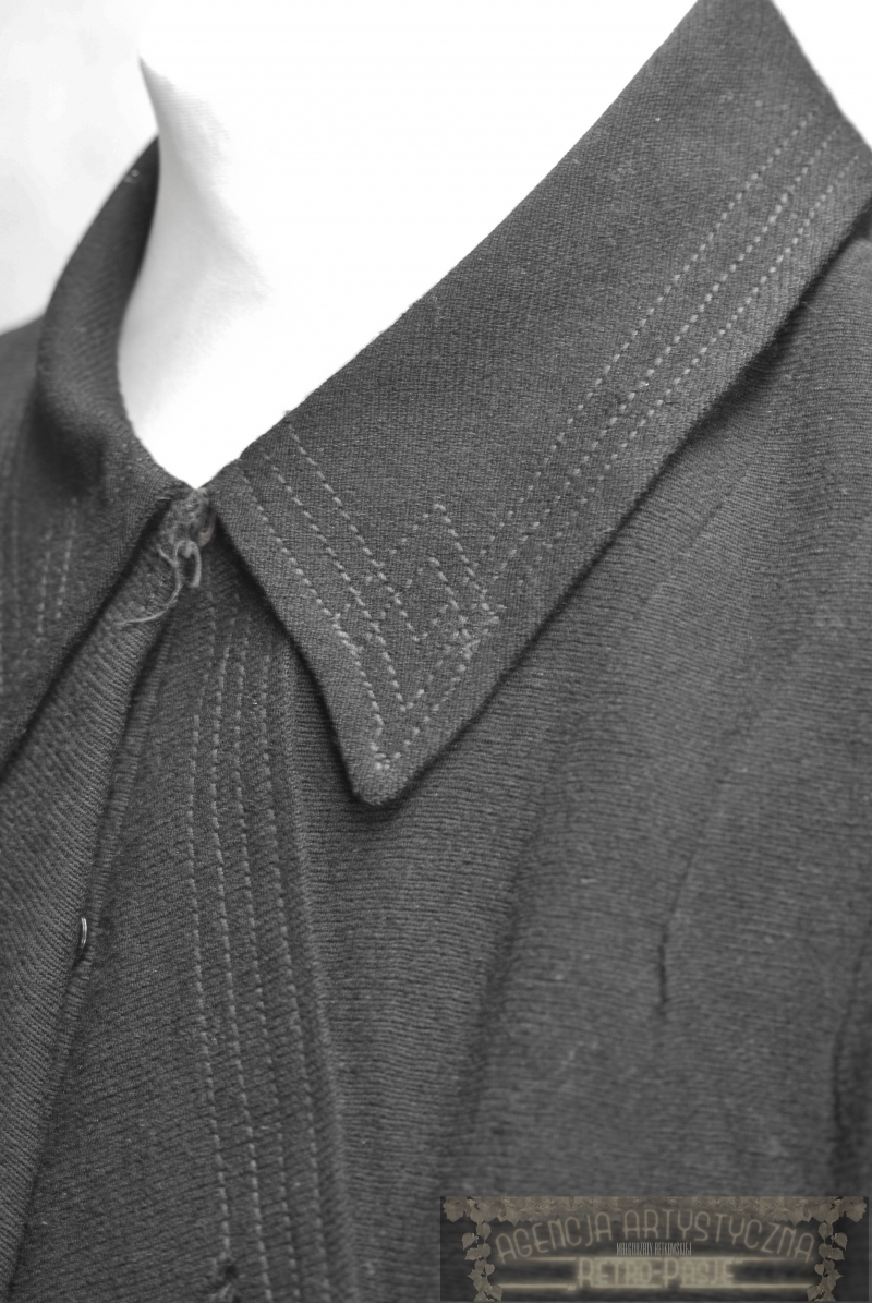 wykonany jest z materiału z wełny z niezwykle ciekawym kołnierzem z ozdobnymi aplikacjami. Posiada 2 ozdobne, szklane guziki przylutowane do metalowego uchwytu w kształcie koła. jeden guzik w stanie szczątkowym. Cały zapinany na zatrzaski, tak jak i mankiety.