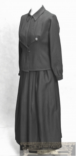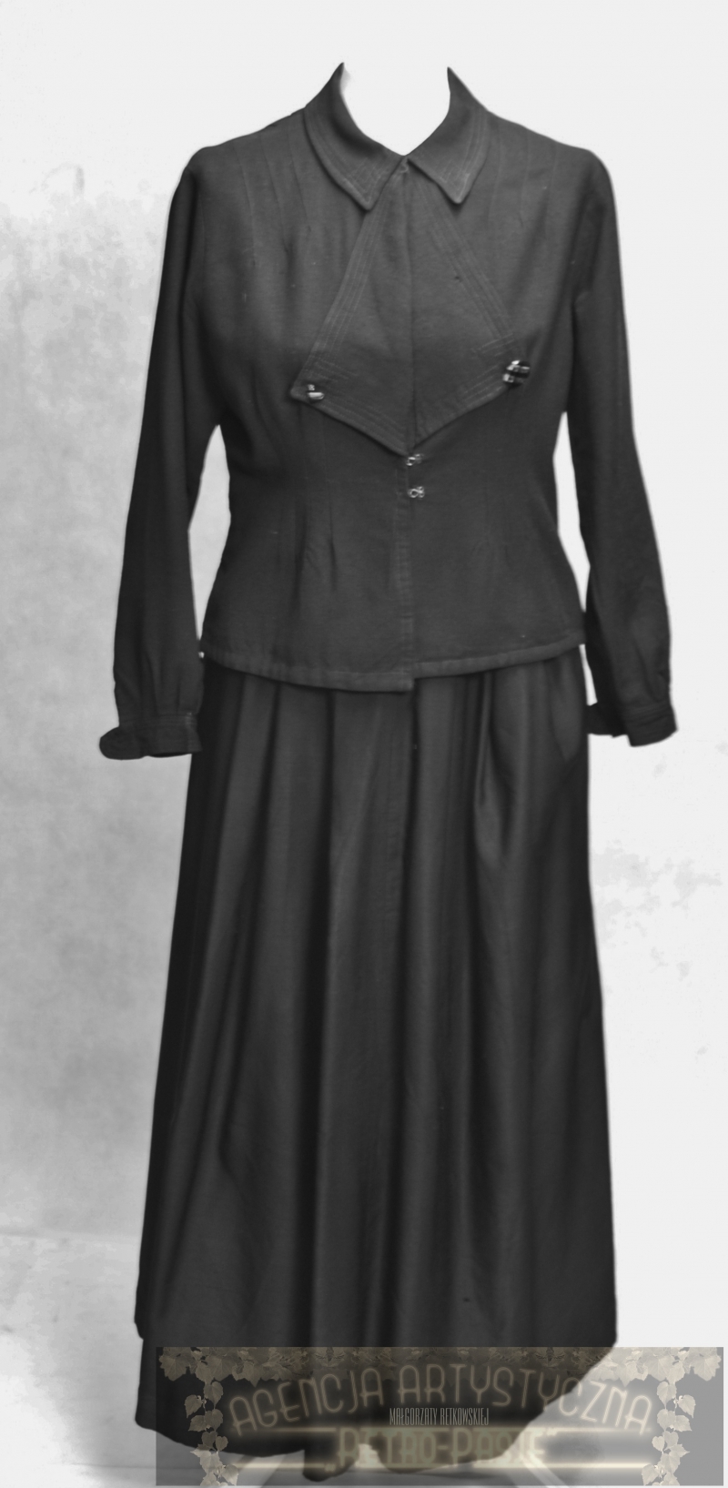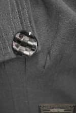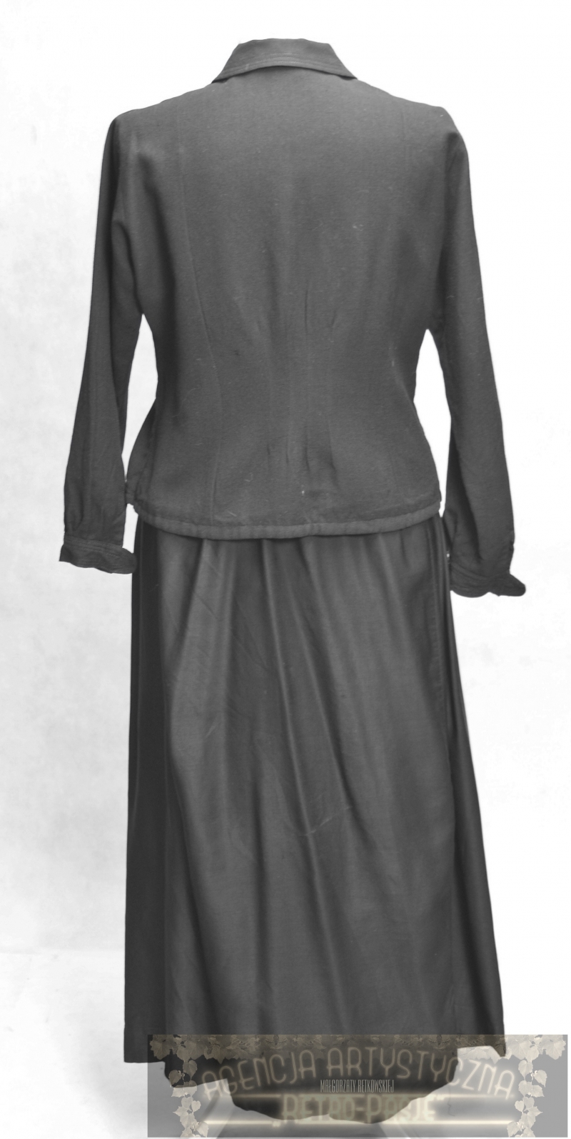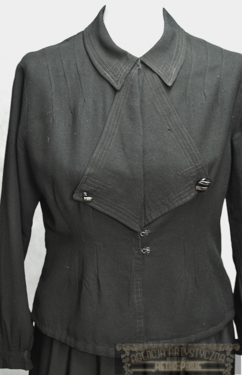 wykonany jest z materiału z wełny z niezwykle ciekawym kołnierzem z ozdobnymi aplikacjami. Posiada 2 ozdobne, szklane guziki przylutowane do metalowego uchwytu w kształcie koła. jeden guzik w stanie szczątkowym. Cały zapinany na zatrzaski, tak jak i mankiety.