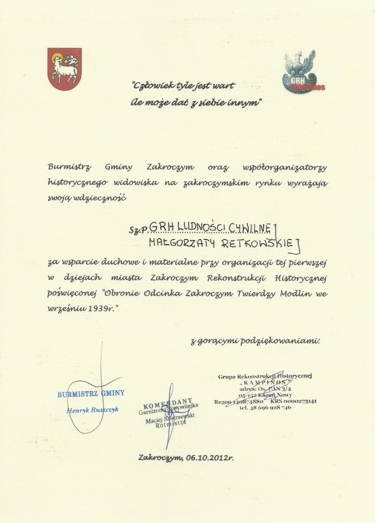 Podziękowanie od Burmistrza Miasta Zakroczym za pomoc i udział w pierwszej rekonstrukcji organizowanej przez miasto Zakroczym.